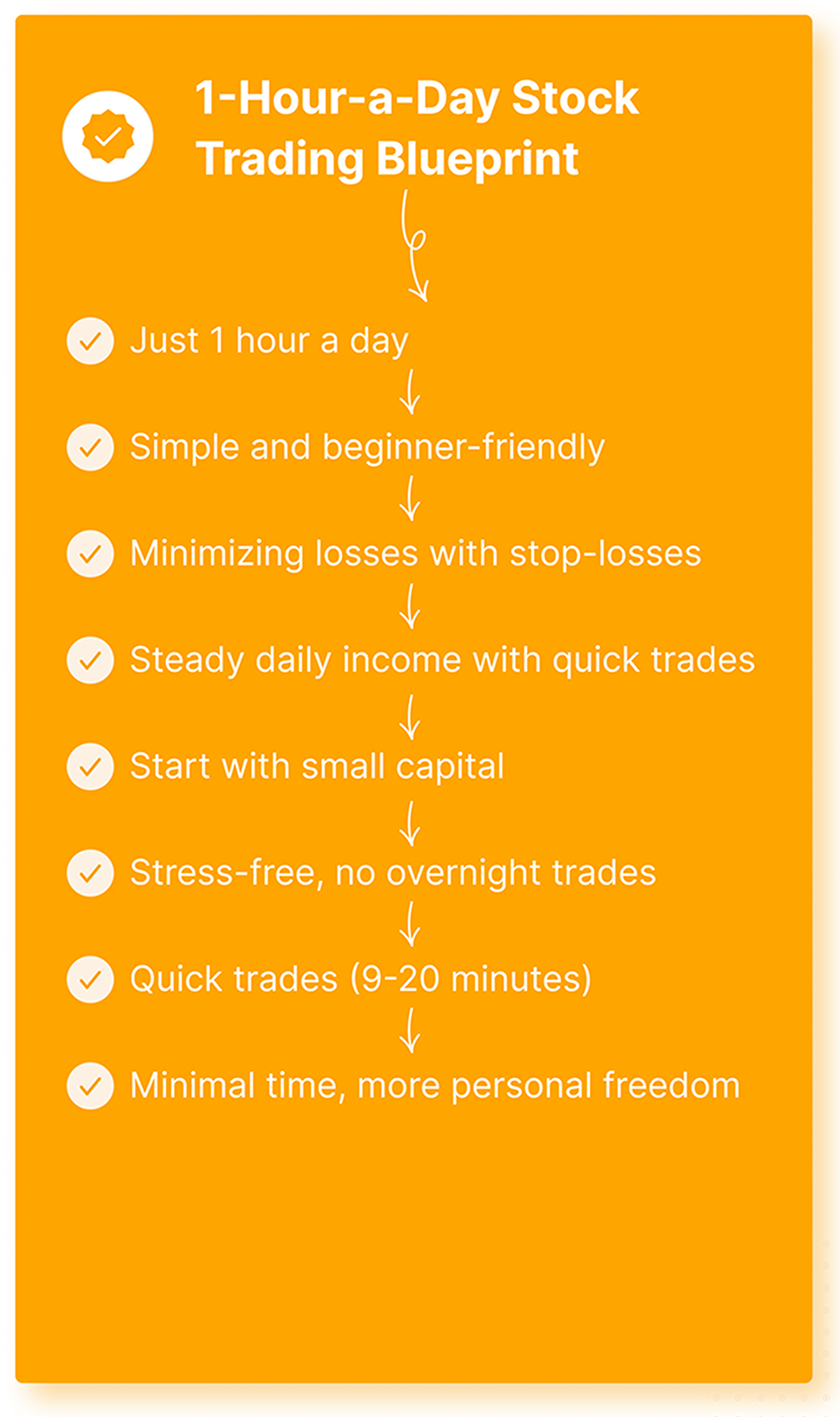 This masterclass is designed with beginners in mind. The 1-Hour-a-Day Stock Trading Blueprint simplifies trading into a step-by-step system that anyone can follow, even with no prior experience. You'll learn the essentials to start trading confidently and effectively.