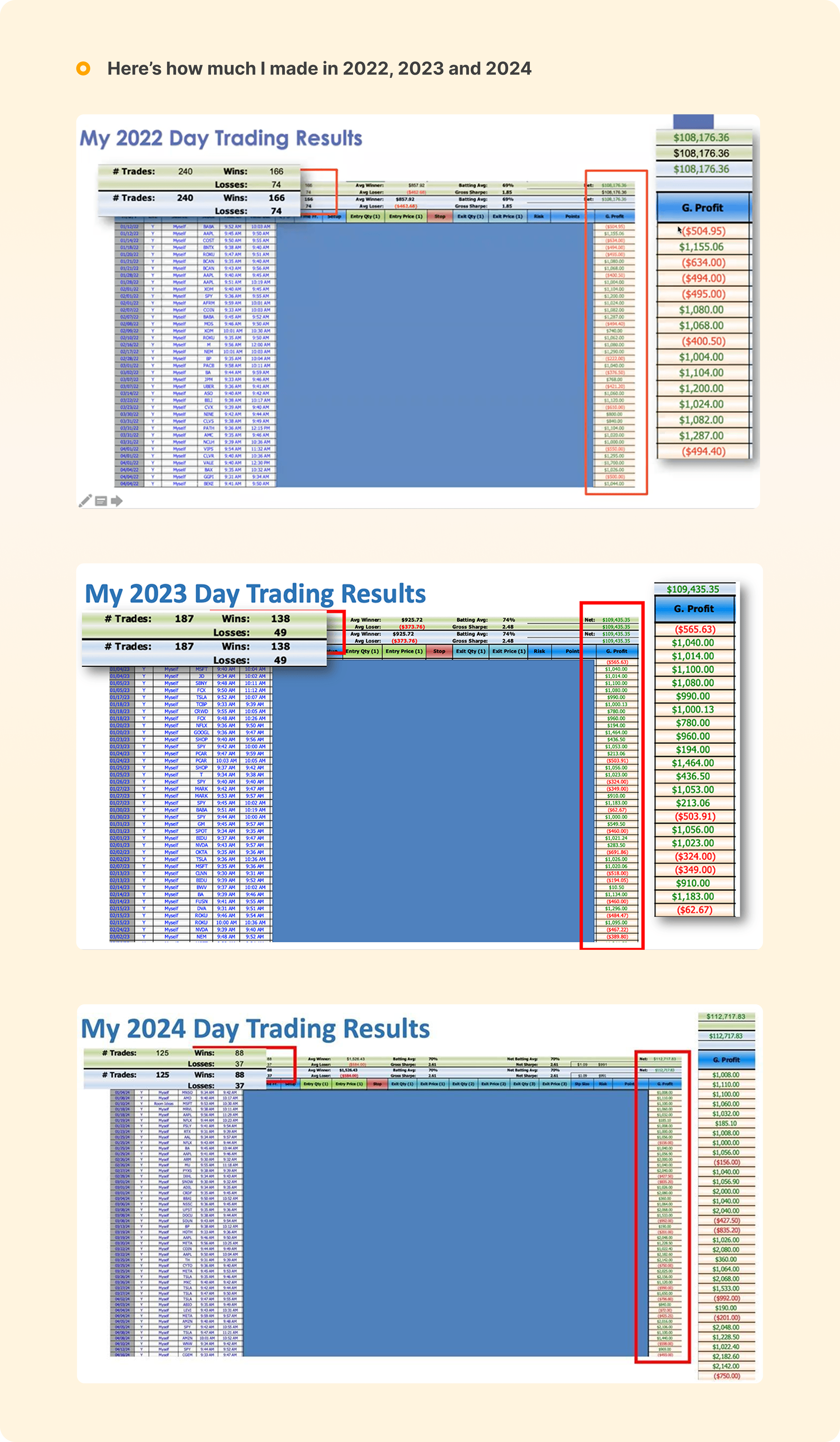 In 2022, I had 166 winning trades and 74 losing trades – making $108,000 in 12 months. And I duplicated similar results in 2023 & 2024.