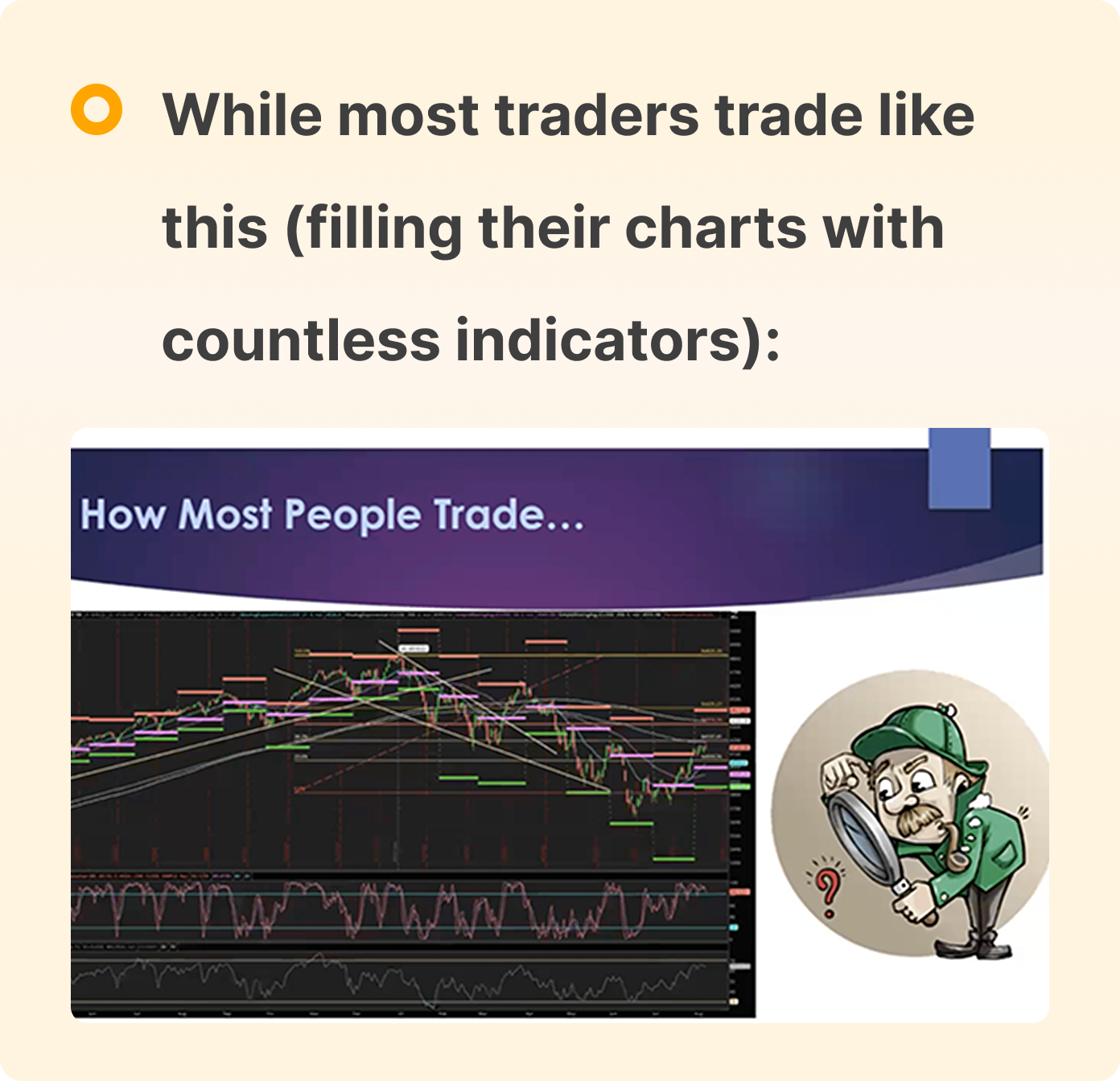 As a corporate banker, I DON’T have the luxury of time to look at charts all day. Hence, I distilled all the strategies, systems, and tactics into a 60-minute Trading Ritual. While most traders trade like this (filling their charts with countless indicators):