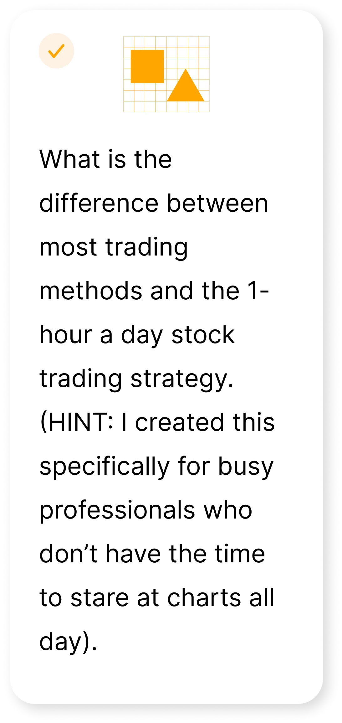 What is the difference between most trading methods and the 1-hour a day stock trading strategy. (HINT: I created this specifically for busy professionals who don’t have the time to stare at charts all day).